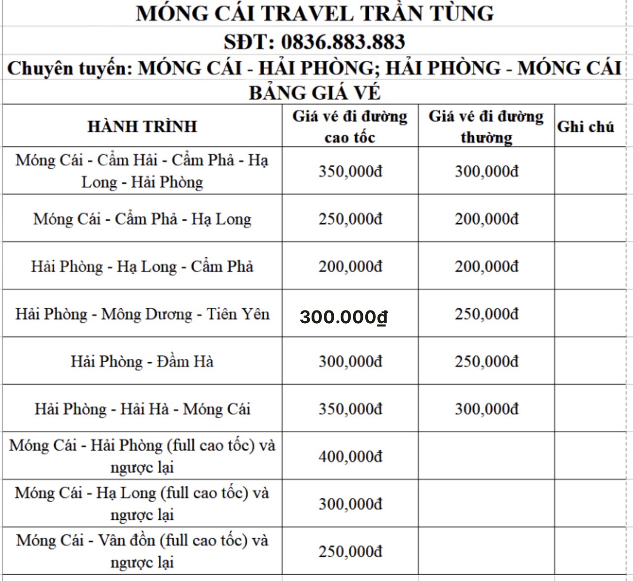 Bảng giá xe Móng Cái Travel Trần Tùng